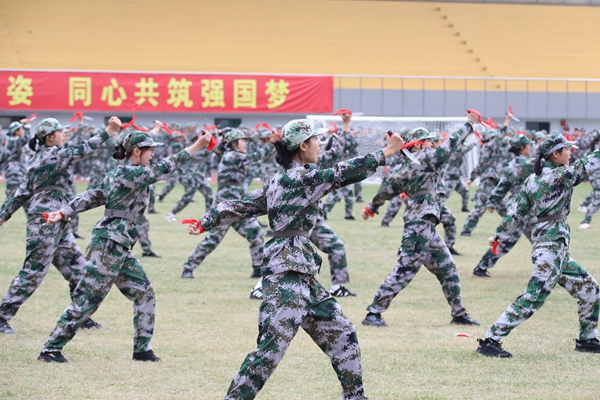 匕首操团队由教师教育学院和人文学院的198名女兵组成,她们化身女战士,用热血和激情,演绎了巾帼不让须眉的气魄和精彩。她们以昂扬的姿态、飒爽的英姿,成为校园中一道最亮丽的风景线。