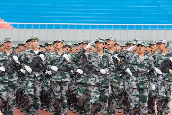 分列式表演中,旅旗和各营营旗组成显赫军旗方阵,紧随其后的是本次军训首次亮相的持枪方阵,由经济管理学院64名学生组成,他们肩扛时代重任,以军人的飒爽英姿,展现了当代青年的蓬勃朝气和风采。随后,各学院组成的方阵依次经过主席台接受检阅。他们步伐整齐,口号嘹亮,每一个方阵都犹如一支训练有素的军队。他们以昂扬的斗志、饱满的精神,向全校师生展示着新时代大学生的风采与活力。
