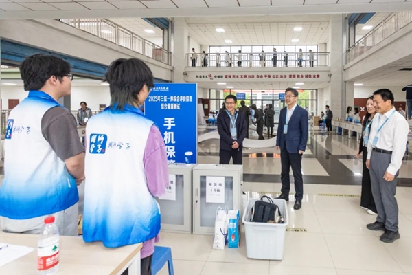 副校长(主持行政日常工作)盛况、校党委副书记丁敢真、副校长舒志定到场现场检查指导测试工作,省、市教育考试院领导到校对测试工作进行巡视。