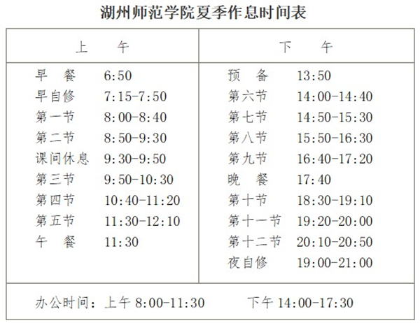 根据学校作息时间安排,自5月6日(星期二)开始实行夏季作息时间表,请各单位做好通知工作,确保调整作息时间后学校各项工作正常有序开展。